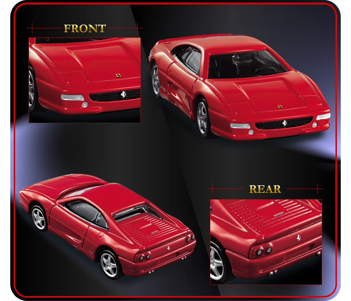 Takara Tomy Ferrari F355 i skala 1:64 har en presis konstruksjon i støpt metall, og er en autentisk miniatyr av denne ikoniske sportsbilen. CE-sertifisert og fri for skadelige kjemikalier, og passer for samlere fra 14 år og oppover. Denne detaljerte kopien er et stilig tilskudd til enhver bilentusiasts samling.